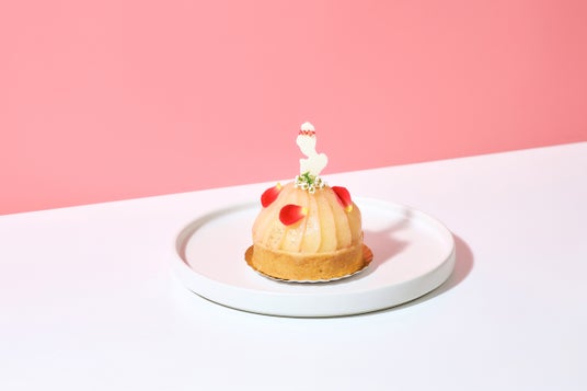 ピンク色のドレスを纏ったプリンセスをモチーフにしたタルト。「ローブ ド マリエ」は花嫁衣裳を意味し、結婚式場を展開するアニヴェルセルならではの特別なケーキです。うっすらピンクに色づいた桃と、香り豊かなアールグレイのムース、酸味の効いたローズヒップピーチティーのジャムをタルト生地の中に忍ばせました。