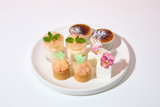 2段目:桃のタルト、チーズムースとエルダーフラワーのジュレ・桃のコンポート、ココナッツとローズヒップピーチティーのムース、クレームブリュレ