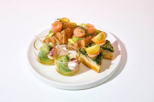 3段目:キッシュミルフィーユ トマトクリームのガトー仕立て、スモークサーモンとアボカドのクロワッサンサンド、生ハムとキウイ・モッツァレラのピンチョス