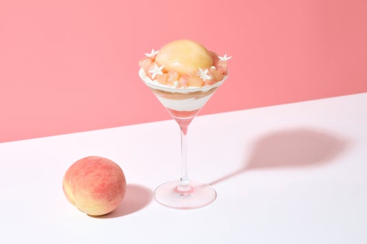 桃を贅沢に1玉使用したパフェ。フレッシュな桃のみずみずしさや香り、素材の甘さをそのまま味わっていただけるよう、パフェの最上段には桃を半玉まるごとトッピングし、周りにはカットした果肉をあしらいました。グラスの中には、爽やかなミントと桃のジュレ、マスカルポーネのクリーム、アクセントで塩の花ともいわれるフルールドセルを使用したサクサクのクッキー生地や桃のシャーベットが入っており、最後まで様々な味わいをお楽しみいただけるよう仕上げました。