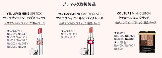 ・一部製品* の販売を行っています。*YSL ラブシャインリップスティック、YSL ラブシャインキャンディグレーズ、クチュールミニクラッチ