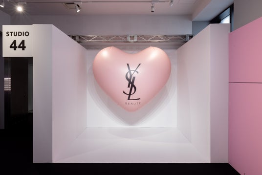 パリのイベントでも1番人気のフォトスポット。YSLロゴをあしらったピンクのハートバルーンを背景に、スター気分でフォトシュート。