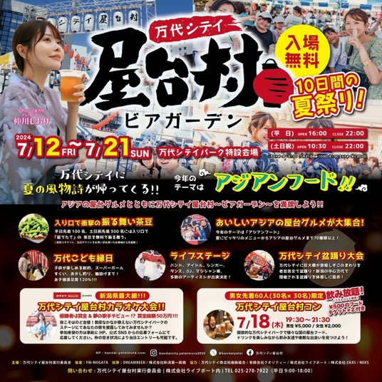 2024年7月12日(金)~7月21日(日)新潟市万代シテイパークにて『万代シテイ屋台村2024~ビアガーデン~』を開催します。万代シテイ屋台村~ビアガーデン~とは、2022年より万代シテイパーク(バスセンター2F)にて毎年開催される、大型ビアガーデンイベントです。
