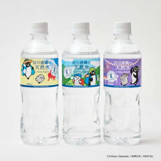 「谷川連峰の天然水 by From AQUA」夏季限定のSuicaのペンギンラベル。Suicaのペンギンと子ペンギンがかわいらしく夏を満喫する様子が描かれており、今年は海辺・山・祭りをテーマに3種のイラストで展開。