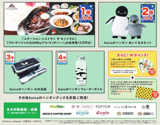 JR東京駅のJR-Crossが運営する施設、店舗、自販機、また上野駅とルミネエスト新宿にあるPenstaにてSuica等交通系電子マネーでのお買いもので、1,500円(税込、合算可)を1回として抽選会に参加できます。お食事券やSuicaのペンギングッズ等が当たるチャンス!