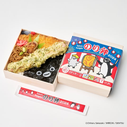 夏まつりをイメージしたパッケージとおかずです。Suicaのペンギンの好物「魚肉ソーセージ磯辺揚」入り!ステッカー1枚付、どの絵柄が出るかはお楽しみに♪(ステッカーは通常3種類とシークレット1種類の全4種類!)