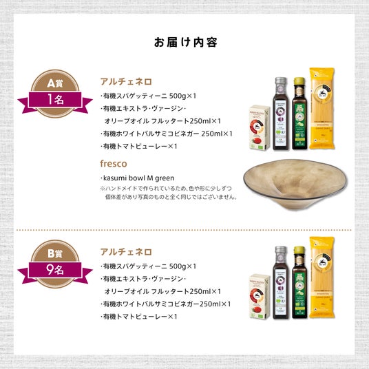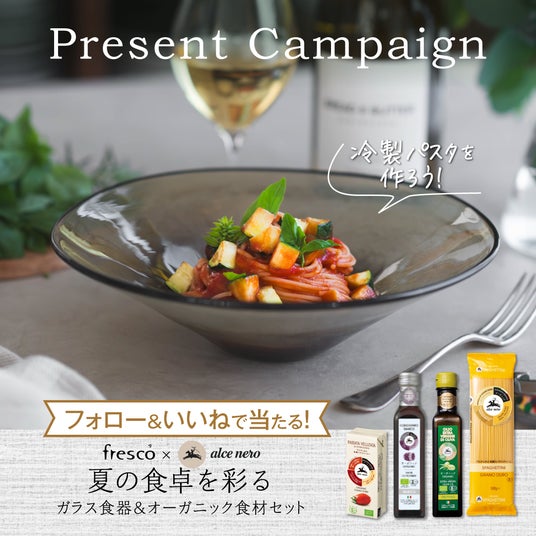 イタリアのオーガニック食材を取り扱う「Alce Nero(アルチェネロ)」は、ガラス工房「fresco(フレスコ)」とコラボレーションし、2024年7月5日(金)~7月21日(日)の期間中Instagramキャンペーンを開催。当選者の10名様にはアルチェネロのオーガニック食材がプレゼントされます。そのうちの1名様にはfrescoの器もセットでお届けする予定です。