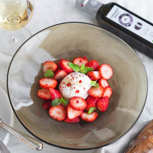 ホワイトバルサミコ・ビネガーを使用した前菜「いちごのブラータチーズ」