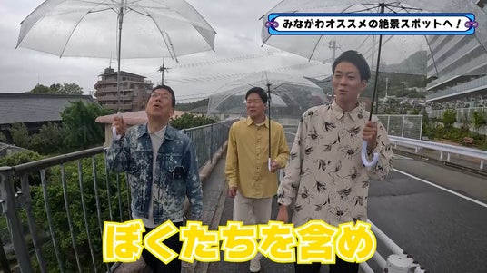 30分ほど坂を登って、みながわが「海まで一望できる、抜群の景色が見られる」というスポットにたどり着いた一行。ただ、この日はあいにくの雨で、きよしは「この天気でも(見られる)?」といぶかしがります。