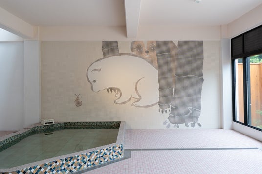 まず、内風呂では男女それぞれ円山応挙、神坂雪佳の愛くるしいわんちゃんの名画をモチーフにしたタイルアートがお出迎えします(それぞれのお風呂は毎日男女入れ替え)。