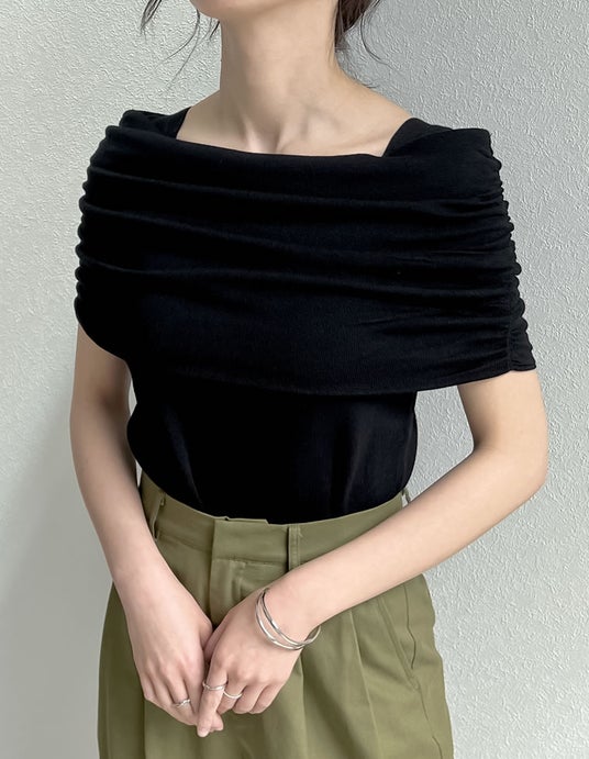 コーディネートにプラスするだけで着映えるレーヨン混オフショルライクニットトップスです。