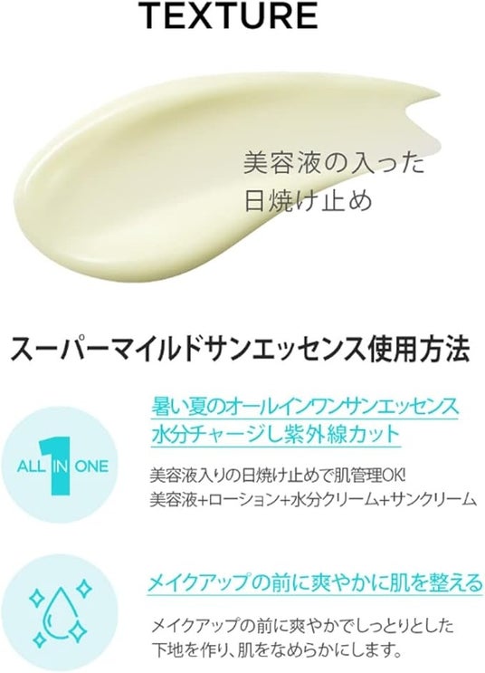 ■ 美容液入りの日焼け止め (サンエッセンス)成分がよりマイルドに肌に刺激になる成分は除きました。 ■ 保湿と紫外線カットを同時によりさらっとしたつけ心地テカリを抑え、爽やかですっきりした仕上がり。