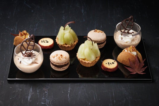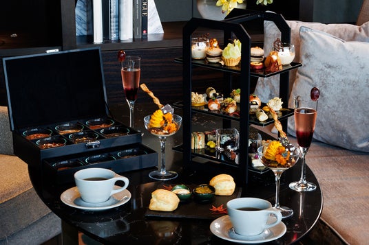 サツマイモやブドウ、マロンなど秋の味覚として欠かせない食材はもちろん、隣接するフレンチレストラン「La Belle Assiette(ラ ベル アシェット)」でご提供するシグネチャーディッシュのテリーヌもミニサイズでお召しあがりいただけます。また、サンマとミモレットチーズ、イチジクとフォアグラ、ビーツとブルーチーズなど、秋の味覚の絶妙なマリアージュもお楽しみいただけます。「カボチャモンブランのパフェ」は、甘味はもちろん、パフェのイメージをくつがえす塩味・酸味・苦味も感じられる工夫をこらした一品です。ゆったりとしたソファ席でくつろぎながら午後のひとときをお過ごしください。