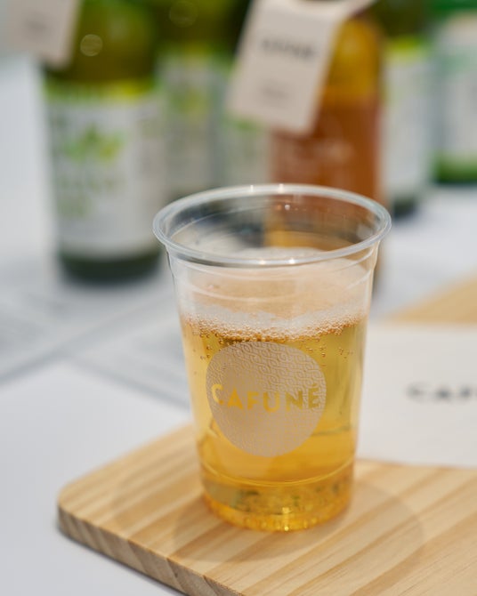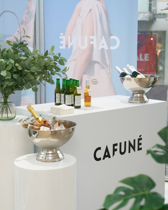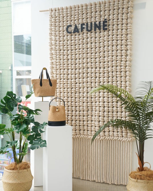 POP UP の期間中、ご来場の皆様にウェルカムドリンクとしてスパークリングティーのご用意や、限定で Cafune がデザインしたオリジナルトートバッグをプレゼントするキャンペーンを開催。そのほか、新作ラフィア素材のコレクションに使用される織り技術を象徴した、高さ 2 メートルのマクラメ装飾をフォトスポットとして設置。思わず写真を撮りたくなるような、涼しげな夏のバカンスムード溢れる空間を演出します。