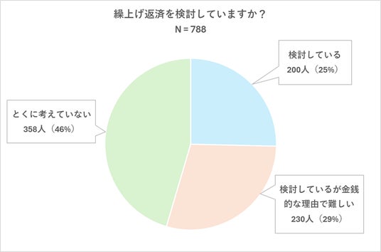 「変動金利でローンを組んでいる」と回答した方のうち788人を対象に「繰上げ返済を検討していますか?」とアンケートをとったところ、200人(25%)が「繰上げ返済を検討している」、230人(29%)が「検討しているが金銭的な理由で難しい」、358人(46%)が「とくに考えていない」と回答しました。