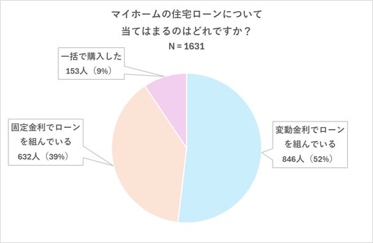 マイホームを購入した30才~55才の男女を対象に「マイホームの住宅ローン」についてアンケートを取ったところ、52%が「変動金利でローンを組んでいる」、39%が「固定金利でローンを組んでいる」、9%が「一括で購入した」と回答しました。