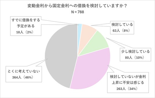 「変動金利でローンを組んでいる」と回答した方のうち788人を対象に「変動金利から固定金利への借り換えを検討していますか?」とアンケートをとったところ、「すでに借り換えの予定がある」と回答したのが18人(2%)、「検討している」と回答したのが63人(8%)、「少し検討している」と回答したのが80人(10%)、「検討していないが金利上昇に不安を感じる」と回答したのが263人(34%)、「とくに考えていない」と回答したのが364人(46%)という結果になりました。