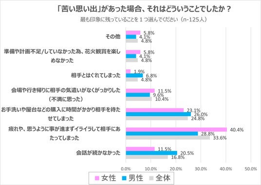 そして3番目に多かった回答では、「会話が続かなかった」で全体では16.8%という結果となりますが、男女間で大きな差が出る回答結果となりました。女性の11.5%に対して、男性は20.5%という結果となり、楽しい時間を異性と過ごすつもりの花火大会で、うまく会話を続けることができなかったという「苦い思い出」を経験しているということがわかりました。