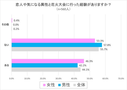 全体で4割を超える44.1%が恋人や気になる異性と花火大会に行った経験があるということから、花火大会は独身男女の年中催事における二人で出かけるデートの主要な一つとして外せない定番イベントであることが調査結果からうかがえます。