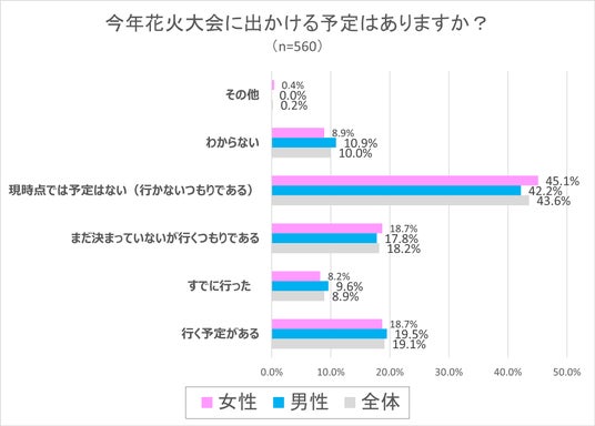アンケート結果では、「行く予定あり」(19.1%)、「すでに行った」(8.9%),または「行く予定である」(18.2%)という結果となり、「行く予定である」を含めるとアンケート対象男女560人のうち全体の約半数近くの46.2%(259人)の20代後半~30代前半の独身男女が、今年花火大会に出かけようとしていることがわかります。