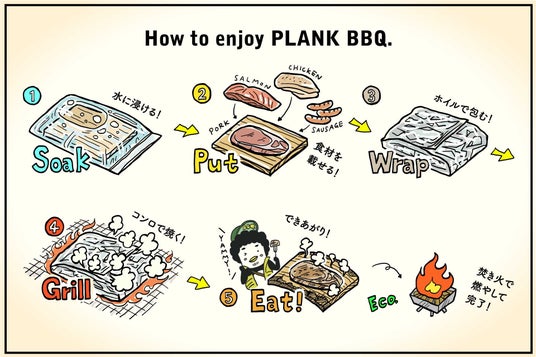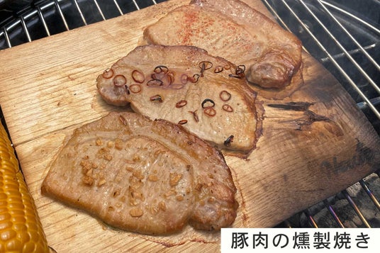 ウッドプランク(木の板)は、いつものバーベキューセットにプラスするだけで、気軽に燻製風味を楽しめるアイテムです。肉や魚などの食材を乗せた木の板ごと焼き上げる豪快な調理方法が特徴で、燻製のような独特の風味やジューシーな焼き上がりを楽しめます。