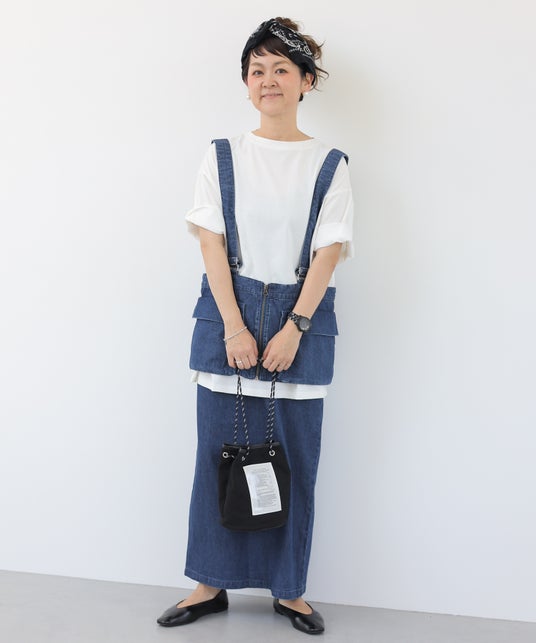 ウエストのギャザーデザインとポケットのタグがポイント。シリーズのベストと合わせればセットアップで着られたり、ジャンスカのような雰囲気にできたりと、多様な使い方ができます。シンプルなデザインなので、さまざまなアイテムとの着回しを楽しめます。