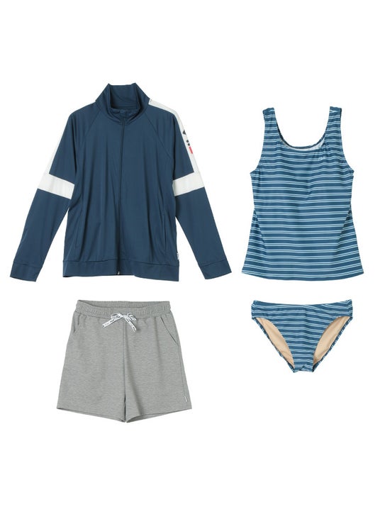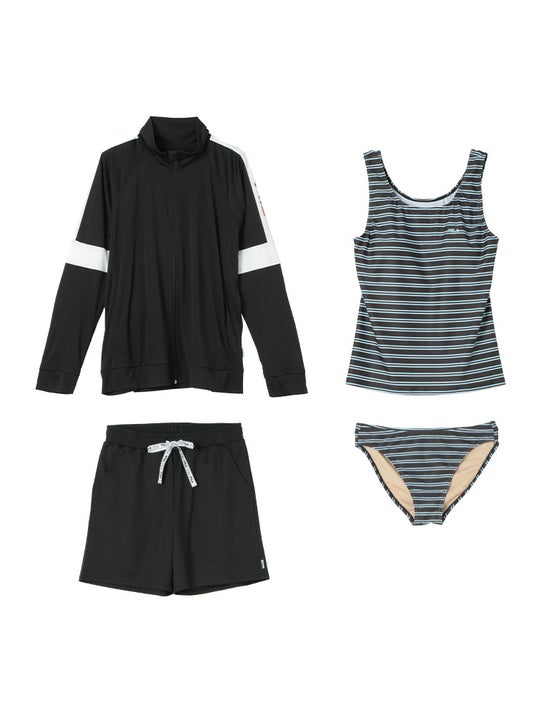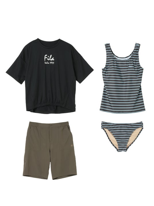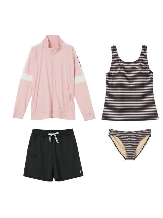 このたび発売したフィラのレディス水着4点セットは、ラッシュジャケット+ショートパンツ+ボーダータンクブラ+スイムショーツのタイプと、デザインロゴTシャツ+ショートパンツ+無地タンクブラ+スイムショーツのタイプの2種です。UVカット素材で日差し対策もバッチリ。水着とセットでラッシュジャケットやTシャツ、ショートパンツが付いているため、プールや海の中だけでなく、ビーチサイドやプール付き施設等で長時間過ごす際に嬉しい仕様となっております。これから始まるバカンスのおともにおすすめの水着セットです。