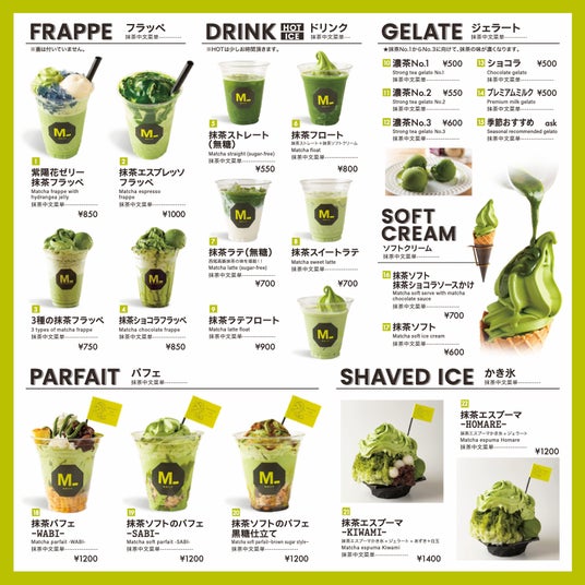 抹茶ラボの人気メニュー「抹茶エスプーマかき氷」「3種の抹茶のフラッペ」「オリジナルジェラート」