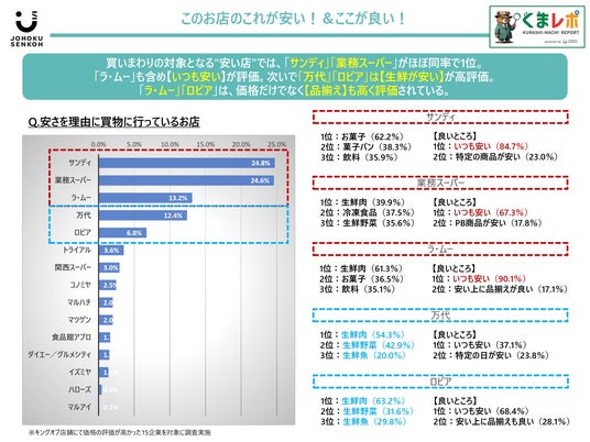 ・安さで選ぶ店は「サンディ」「業務スーパー」がそれぞれ約1/4の得票でトップ2
