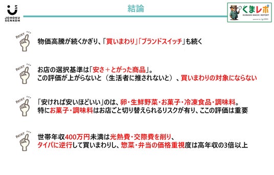弊社独自の人気店調査ランキング「キングオブ店舗 スーパーマーケット編」の結果も交えつつ、物価高騰による生活者の購買行動の変化や、望まれるお店などをくらし・まちレポート”くまレポ”としてお届けする。