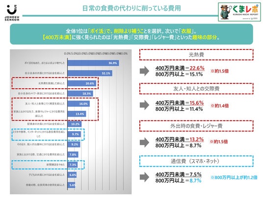 ・回答者の世帯年収別で比較すると、400万未満は「光熱費」「交際費」等が傾向強まる