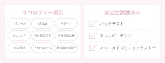 9つのフリー設計*7と3種類の安全性試験済み。デリケートな季節やホルモンバランスのゆらぎにも寄り添えるよう、やさしさをとことん追求しました。