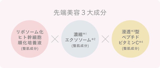 濃縮*1エクソソーム*2(*1 不純物を独自技術により濾過すること*2ヒト脂肪由来間葉系細胞エクソソーム)浸透*3型ペプチドビタミンC*4(*3 角質層まで*4 アスコルビルメチルカルボニルペンタペプチド-72-トリ-t-ブチルトリプトファナミド)