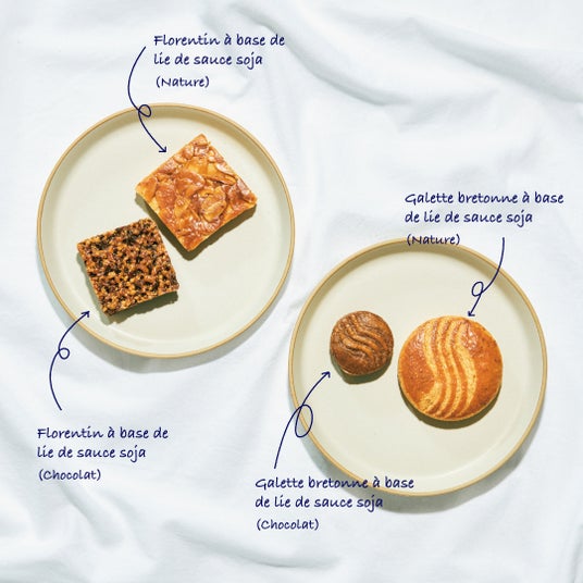 醤油粕は畑の肥料や家畜への飼料にもなる一方で、産業廃棄物として捨てられてしまうことも。そんな素材をhannocの若きパティシエにフランスの焼き菓子「ガレットブルトンヌ」と「フロランタン」に落とし込んでもらい、今までになかった醤油粕の楽しみ方をご提案いたします。