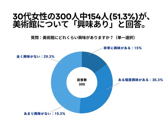 30代女性の300人を対象とした「美術館にどれくらい興味がありますか?」というアンケートで154人(51.3%)が「美術館について興味あり」という結果になりました。