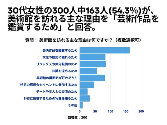 30代女性の300人を対象とした「美術館を訪れる主な理由は何ですか?」というアンケートで163人(54.3%)が「芸術作品を鑑賞するため」という結果になりました。