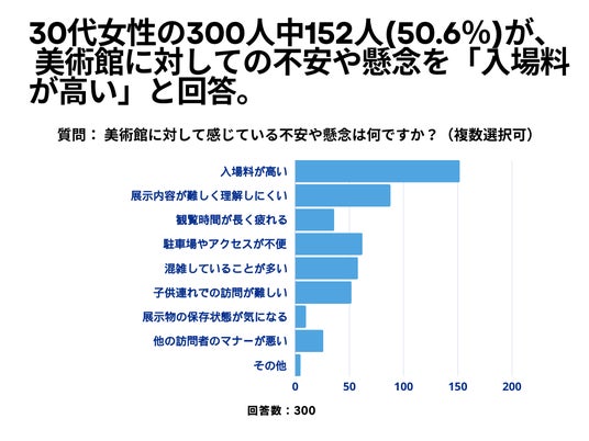 30代女性の300人を対象とした「美術館に対して感じている不安や懸念は何ですか?」というアンケートで152人(50.6%)が「入場料が高い」という結果になりました。