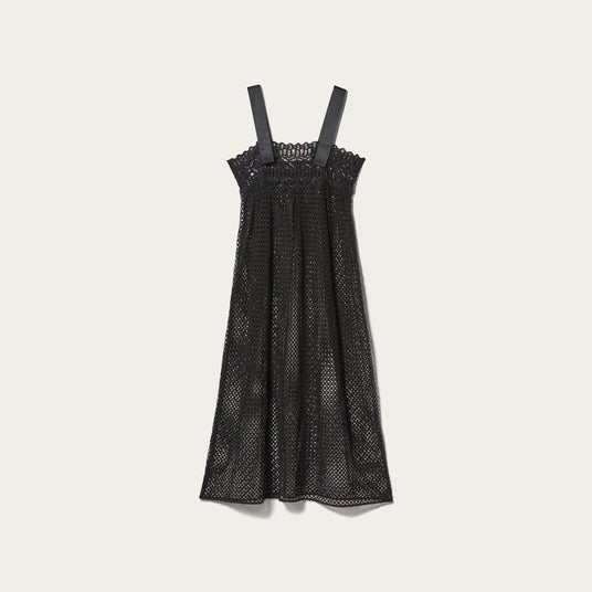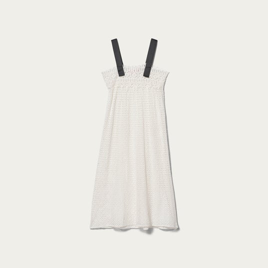 胸回りと胸下で模様の異なるケミカルレースを組み合わせ、肩ひもは太めのリボンを使用することでモードな印象に仕上げました。インナードレスはつけず、レイヤードスタイルを楽しめる仕様でおつくりしました。シーズンレスで着用でき、コーディネートのアクセントになる一着です。