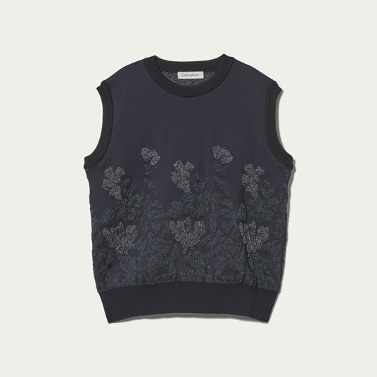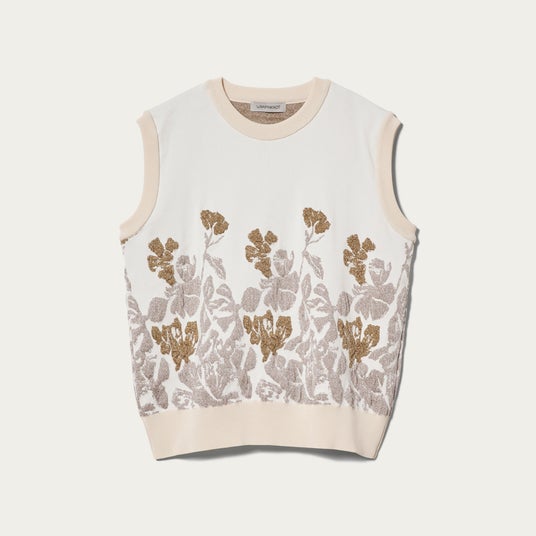 ロングシーズン楽しめるように素材はポリエステルを採用。凹凸感が表情のある草花の柄部分には、落ち着いた印象のラメ糸を使用しています。ノースリーブとして一枚着でも、トップスを重ねてベストとしても着用いただけます。