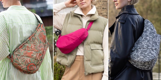 左から:アーシーグリーンとラスティーカラーが調和する「プリント Sサイズ アールヌーヴォー」、華やかなアクセントカラー「リサイクルナイロン スリング ハイビスカス」、トーンの異なるソフトグレーの糸で構成されたコットンブレンドの織生地「クラウドカモ Sサイズ」