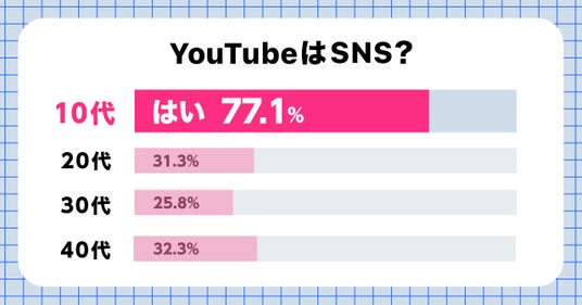 今回の調査結果で、全世代で顕著に認識の違いが出たのが、オンライン動画共有プラットフォームのYouTube。YouTubeを知っていると回答した人への調査では、YouTubeをSNSだと思っているのは30代が25.8%、40代は32.3%。20代でも31.3%ですが、10代は77.1%がYouTubeをSNSだと認識しているという結果になりました。
