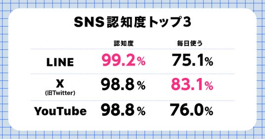 なお、上記のサービスの認知度について、LINEが99.2%、続いてX(旧Twitter)・YouTubeを98.8%が「知っている」と答え、高い認知度がありました。
