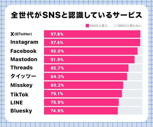 アンケートは、LINE、LINE VOOM、Simeji、Lemon8、カカオトーク、X(旧Twitter)、Facebook、Instagram、Threads、TikTok、YouTube、ニコニコ動画、Twitch、ツイキャス、BeReal.、Mastodon、Misskey、Bluesky、タイッツー、Discord、Skype、Pococha Live、IRIAM、17LIVE、ふわっち、Spoon、リヴリーアイランド、ポケコロツイン、GRAVITY、note、whoo – ふー、Jagat、パラレル、Pinterest、Tumblr、Flickr、SNOW、Snapchat、mixi、Weverseといったサービスの認知度や使用頻度などを聞きました。