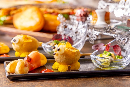 さらに子犬に見立てた一口サイズの「アメリカンドッグ」と、犬の好物の骨をイメージしたブレッドに生ハムとイチジクのチャツネを添えた「骨型ブレッド」など、見た目にもこだわったセイボリーも充実。また、オニオン、ベーコン、チーズのスコーンやケシの実を練りこんだカイザーゼンメルにフライドチキンやトマトを挟んだサンドイッチやピロシキなどは、ワゴンサービスでお好きなだけお召しあがりいただけます。