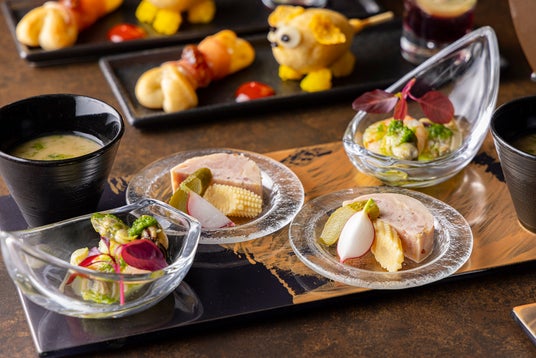 「アメリカンドッグ」や「骨型ブレッド」のほか、あおさの出汁を利かせた「焼きナスのフラン」、鴨肉を煮込んだソースをショートパスタと和えた「鴨肉のラグーパスタ」、「牛タンスモーク」、などをご用意。土日祝日はフリーフロー付きのプランもご利用いただけます。