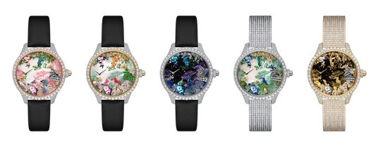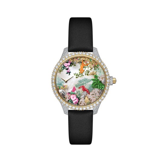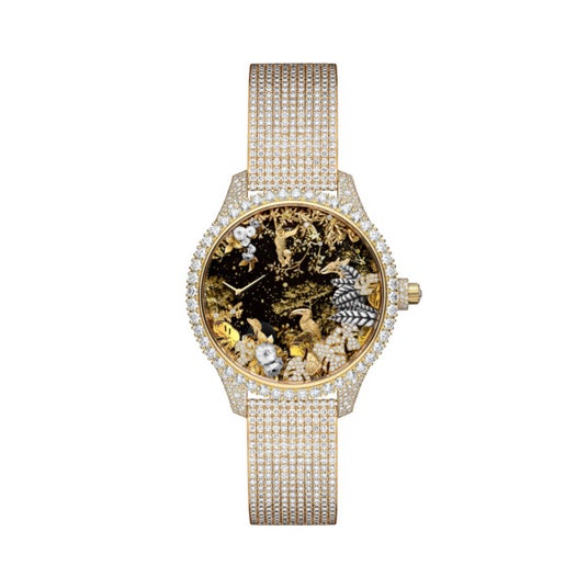 同コレクションの中でもムッシュ ディオールが愛した動植物をデザインテーマに表現した「ディオール グラン ソワール オートマタ ジャルダン レヴェ」タイムピーシズは、私たちを夢の庭園へと誘います。