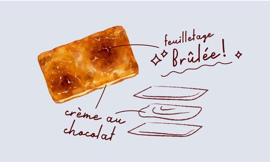 表面をブリュレ仕立てで香ばしく焼いたサクサクパイで、ショコラクリームをサンド。芳醇なラムバニラの薫りが、カスタード香るショコラクリームのコクをひきたてます。