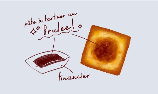 北海道発酵バターと香り高いスペイン産アーモンドを使ったバターフィナンシェ。表面を香ばしく焦がしたブリュレショコラスプレッドを埋めこんで、しっとりとジューシーに仕上げました。