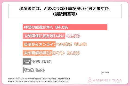 また、調査の最後に「出産後には、どのような仕事が良いと考えるか」を訊く設問への回答では1位が「時間の融通が効く」で84.0%。2位が「人間関係に気を遣わない」で42.3%、3位「自宅からオンラインでできる」で32.6%という結果となりました。いずれも子育てをしながらでも取り組みやすく、また、仕事を通じたストレスも少ないものが上位の回答に並ぶ結果となりました。