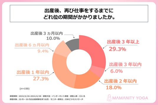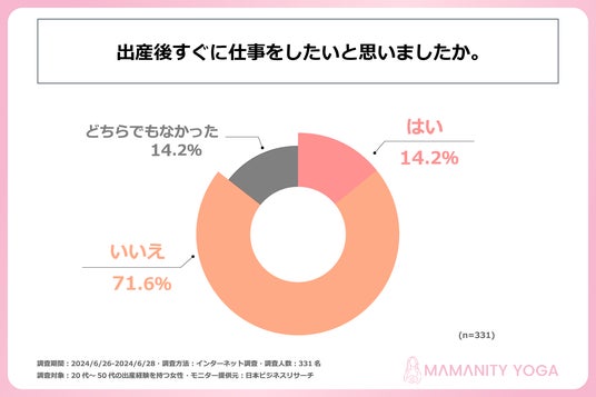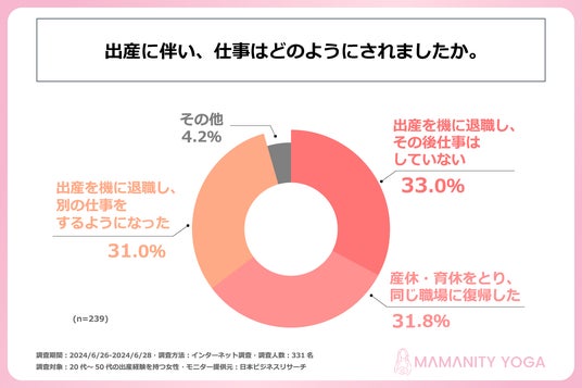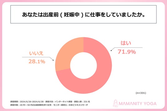 近年、子どもがいる世帯の半数以上が共働きをしていると言われています。ただ、妊娠中は、一時的に仕事を続けることが難しくなります。また、出産後も子どもに付きっきりになるケースが多く、子どもが少し大きくなると子どもを預かってくれる保育園が見つかるまで、仕事をしたくてもできないと考える方は多いのではないでしょうか。そこで、妊娠中、出産後のママ向けにオンラインヨガ講座のインストラクター育成プログラムを提供する株式会社mamamaison & Co.は、20代~50代の出産経験のある女性を対象に「妊娠中・出産後の仕事」に関する調査を実施しました。